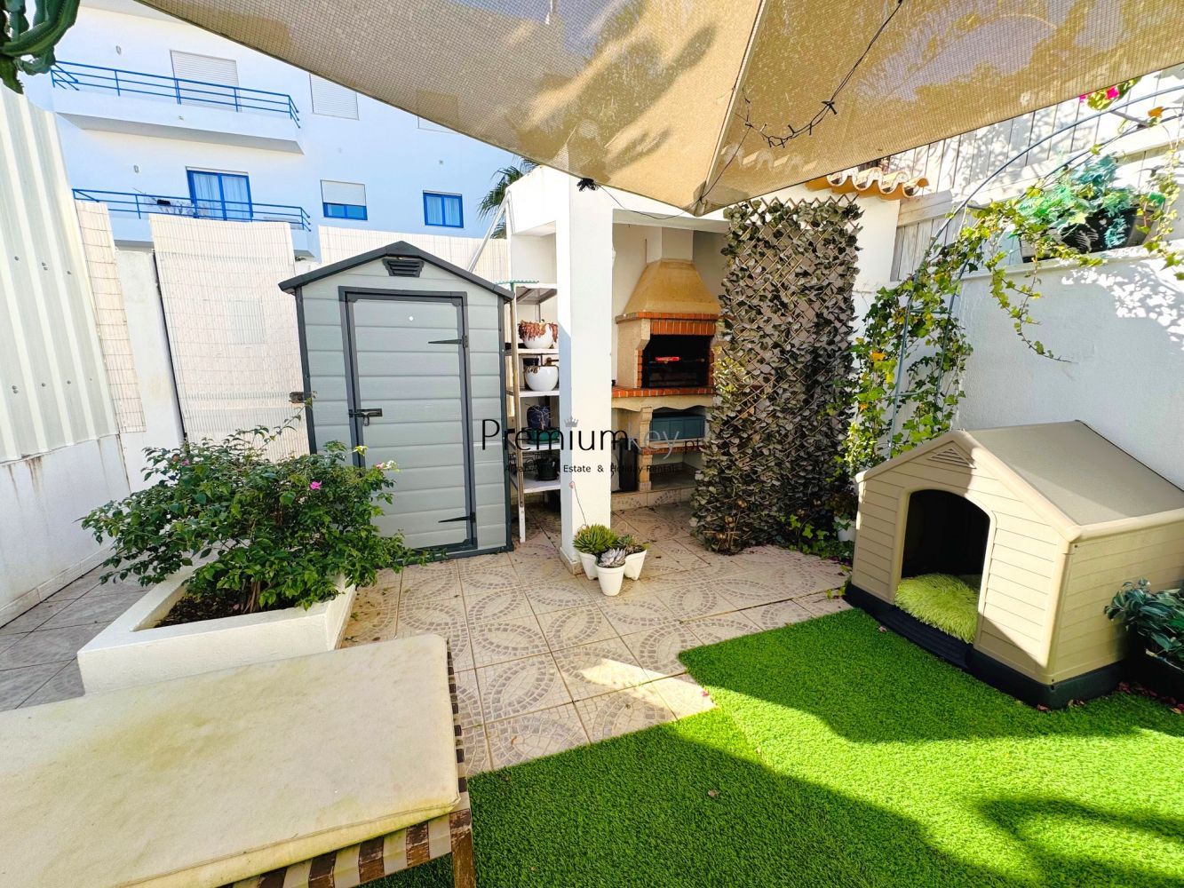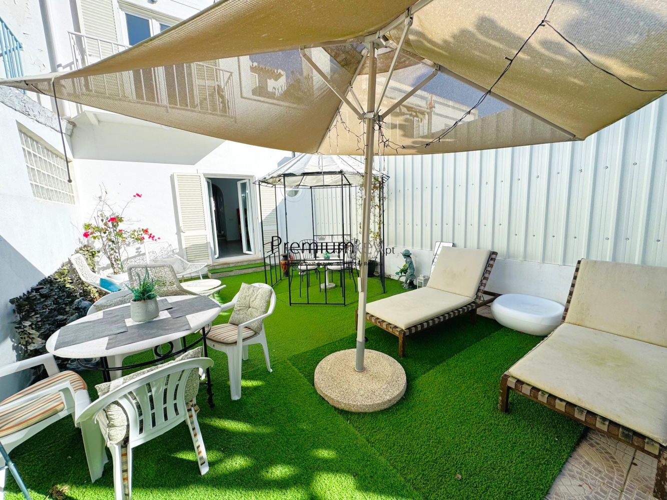 No espaço exterior a moradia possui dois quintais, um virado a Nascente com carport e outro virado a Poente com barbecue e espaço de laser com relva sintética.