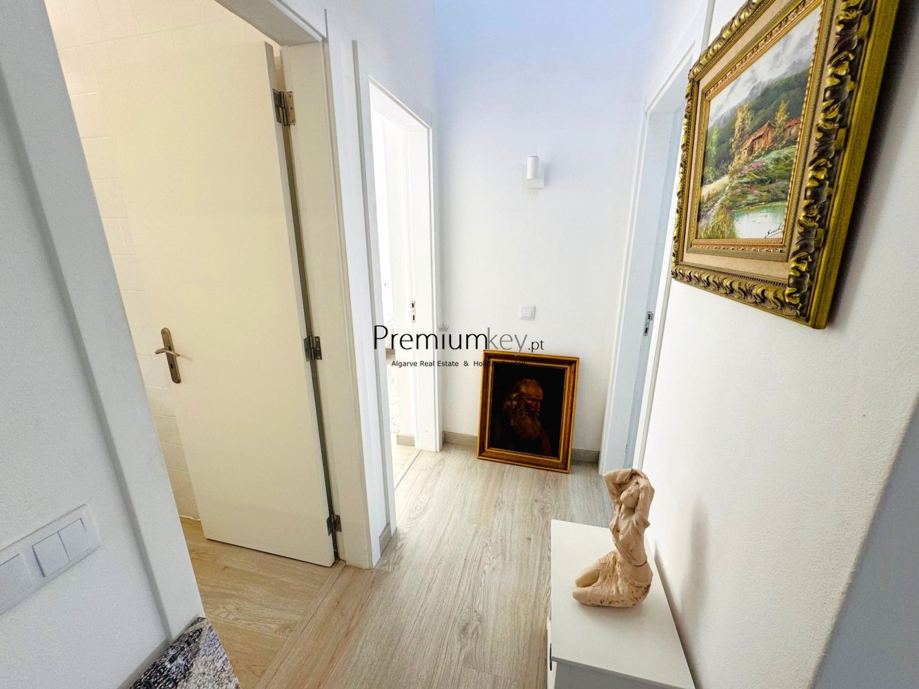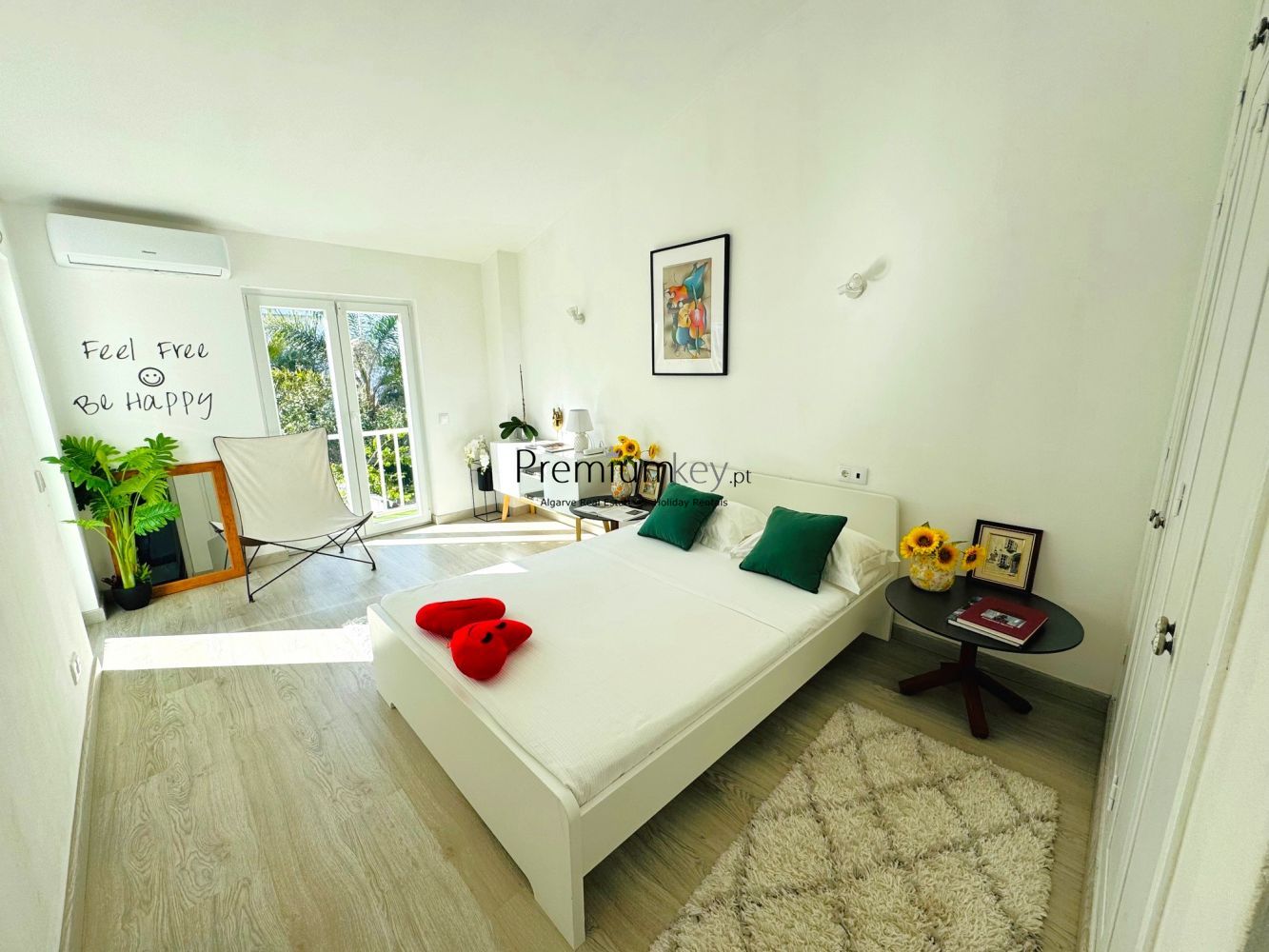 1º Andar: Quarto virado a Nascente com varanda e roupeiro, casa de banho com banheira, quarto virado a poente com duas varandas e roupeiro.