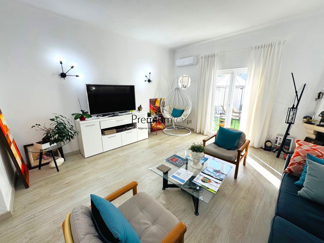 Em termos de acabamentos está equipada com: vidros duplos, caixilharia dupla com corte acústico e térmico, portas e janelas com sistema basculante, portadas de alumínio, alarme, rega automática e ar condicionado na sala e quartos.