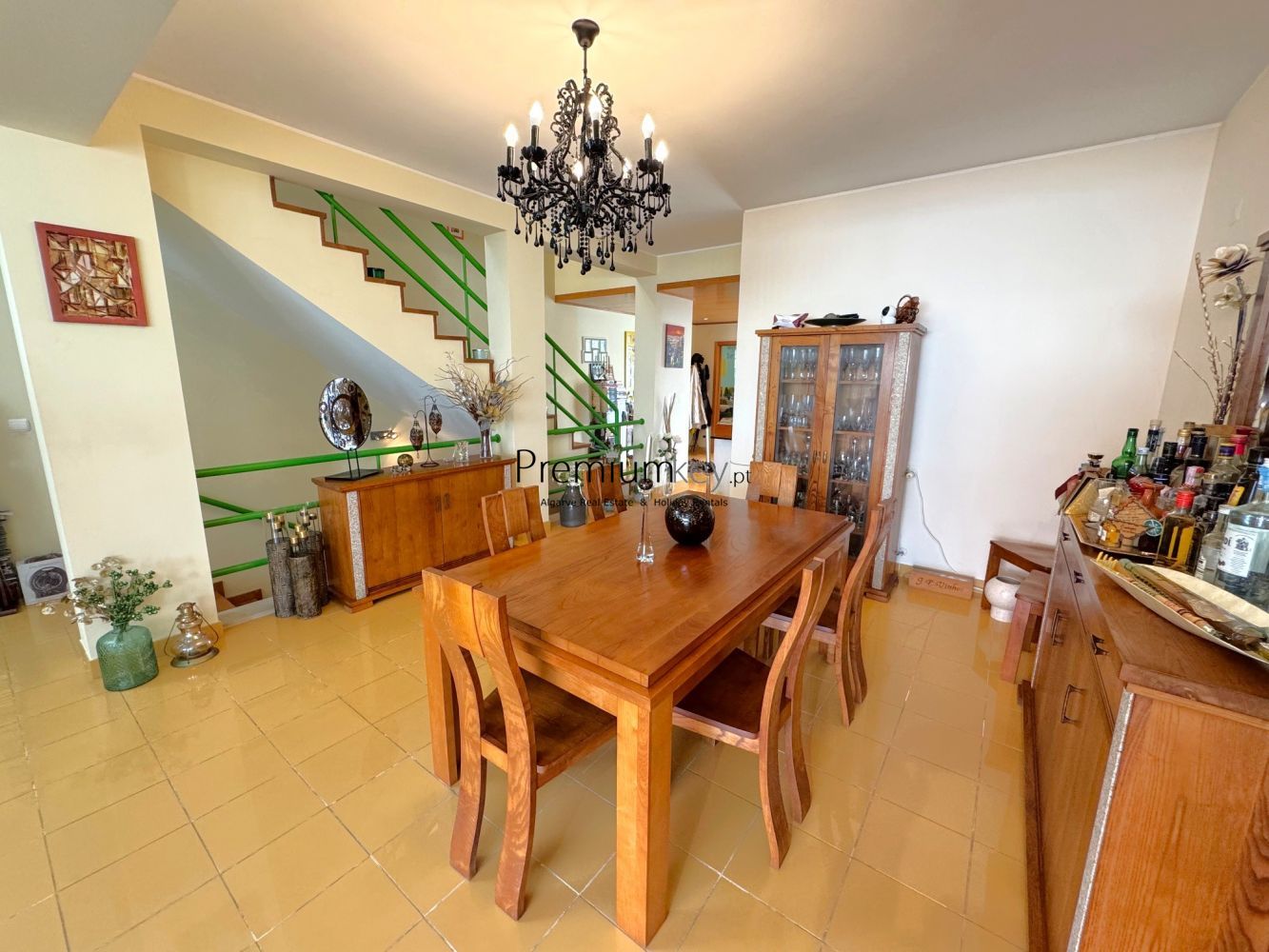 R/C: sala de estar e jantar, w/c, despensa, cozinha equipada acesso directo à piscina e à cave;